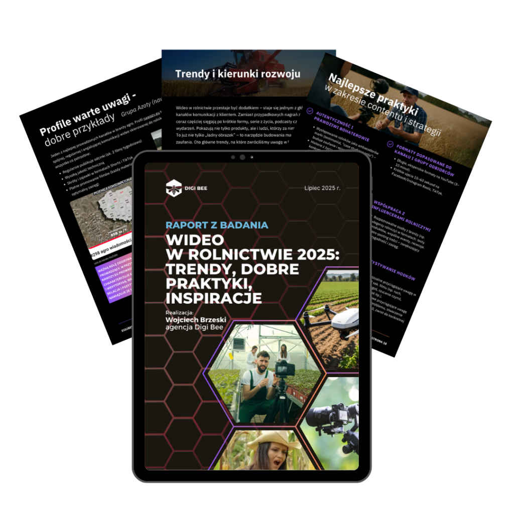 Chcesz wyprzedzić konkurencję w branży agro? W raporcie „Wideo w rolnictwie 2025: trendy, dobre praktyki, inspiracje” znajdziesz profile firm, które pokazują, jak robić to dobrze. Sprawdź, co działa i jak zrobić to lepiej! Odkryj najnowsze trendy i kierunki rozwoju, które warto wdrożyć w swojej komunikacji. Poznaj topowych influencerów, z którymi warto nawiązać współpracę, by zwiększyć zasięg i wiarygodność. Poznaj sprawdzone metody tworzenia angażujących treści, efektywnej produkcji wideo oraz skutecznej promocji w mediach, które pomogą Ci osiągnąć lepsze wyniki. Co więcej, dowiedz się, jakich błędów unikać w reklamach rolniczych, by nie tracić czasu i budować silną, wiarygodną markę.